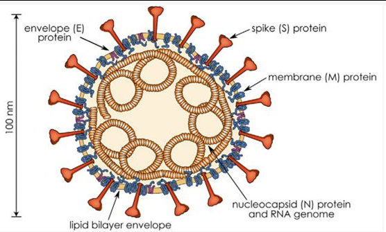 冠状病毒具体结构包括磷脂双分子层,核衣壳蛋白(N蛋白)与RNA基因组,刺突蛋白(S蛋白),膜蛋白(M蛋白)和包膜蛋白(E蛋白),如下图所示。冠状病毒的大小略有不同,但平均大小约为100nm。
