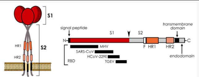 冠状病毒刺突蛋白(S蛋白)是病毒附着于宿主细胞受体以及病毒包膜与宿主细胞膜融合所必需的。冠状病毒刺突蛋白(S蛋白)以三聚体的形式装配,具有短的胞质尾和疏水跨膜结构域,将蛋白质锚定到膜中。S蛋白分为S1和S2两个区域,在病毒颗粒成熟和组装过程中,它们有时被细胞蛋白酶分解成不同的蛋白质。S1包含受体结合域(receptor-binding domain ,RBD),已被证明为冠状病毒提供了特异性的附着。SARS-CoV可与人血管紧张素转换酶2(ACE2)结合。