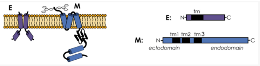 膜蛋白(M蛋白)是一种有三个跨膜的蛋白,是冠状病毒中含量最丰富的病毒结构蛋白。M蛋白的胞外域通常被糖基化,然后是三个跨膜域和一个内域,这对于与核衣壳蛋白相互作用和病毒基因组包装很重要。