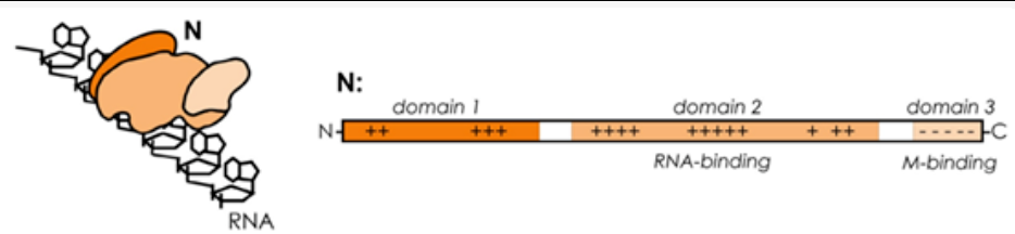 核衣壳蛋白(N)是一种RNA结合蛋白,与冠状病毒的gRNA结合形成核蛋白复合物。蛋白的结构如下图所示,N蛋白的结构域1和2富含精氨酸和赖氨酸(用+表示)。N蛋白磷酸化,主要是在丝氨酸残基,但磷酸化的作用目前尚不清楚。N蛋白具有三个保守结构域,每个结构域由高度可变的间隔子元件隔开。区域1和2富含精氨酸和赖氨酸残基,这是许多RNA结合蛋白的典型特征。区域3对于与M蛋白相互作用和感染性病毒颗粒的组装至关重要。N蛋白已被证明是冠状病毒 RNA合成中的重要辅助因子。