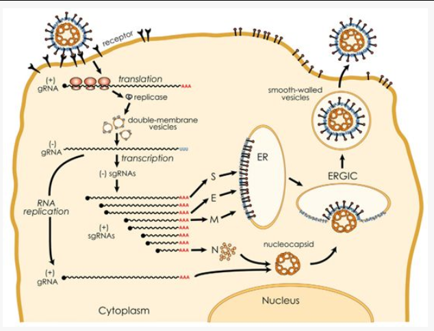 一旦正链RNA基因组被释放,它就可以作为信使RNA(mRNA),并且5'端(ORF1a和ORF1b)被核糖体翻译,以产生依赖病毒RNA的RNA聚合酶多聚蛋白,称为病毒复制酶。复制酶多蛋白由复制酶编码的蛋白酶(木瓜蛋白酶,脊髓灰质炎病毒3C蛋白酶)加工以生成16个成熟的复制酶产物。这些病毒复制酶蛋白螯合宿主细胞膜以产生独特的双膜囊泡(DMVs),在那里进行RNA合成。