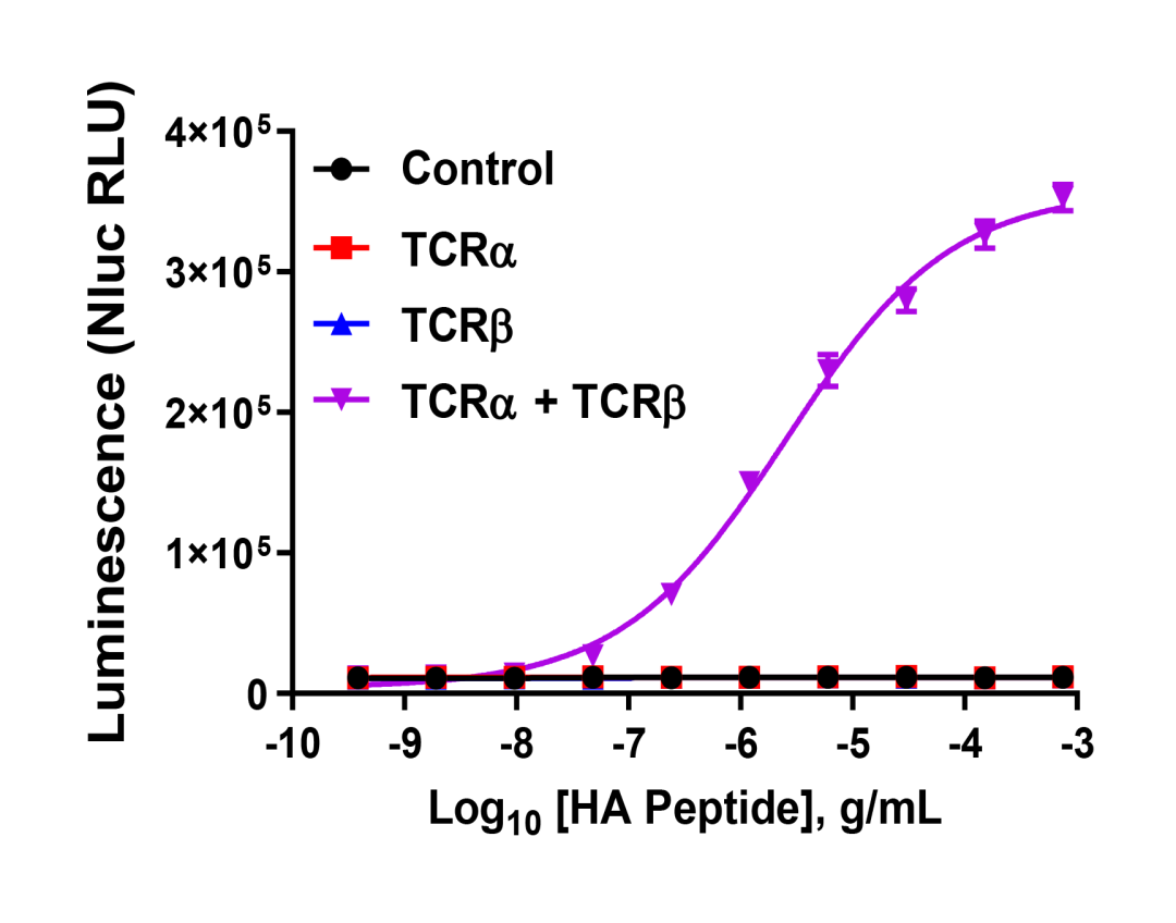 抗原特异性TCRα和β链的表达导致MHCII阳性细胞呈递的流感HA肽剂量依赖性报告基因活化。