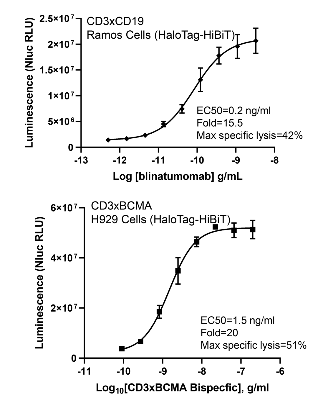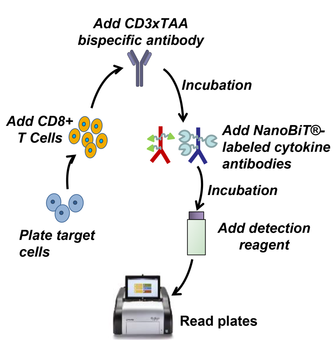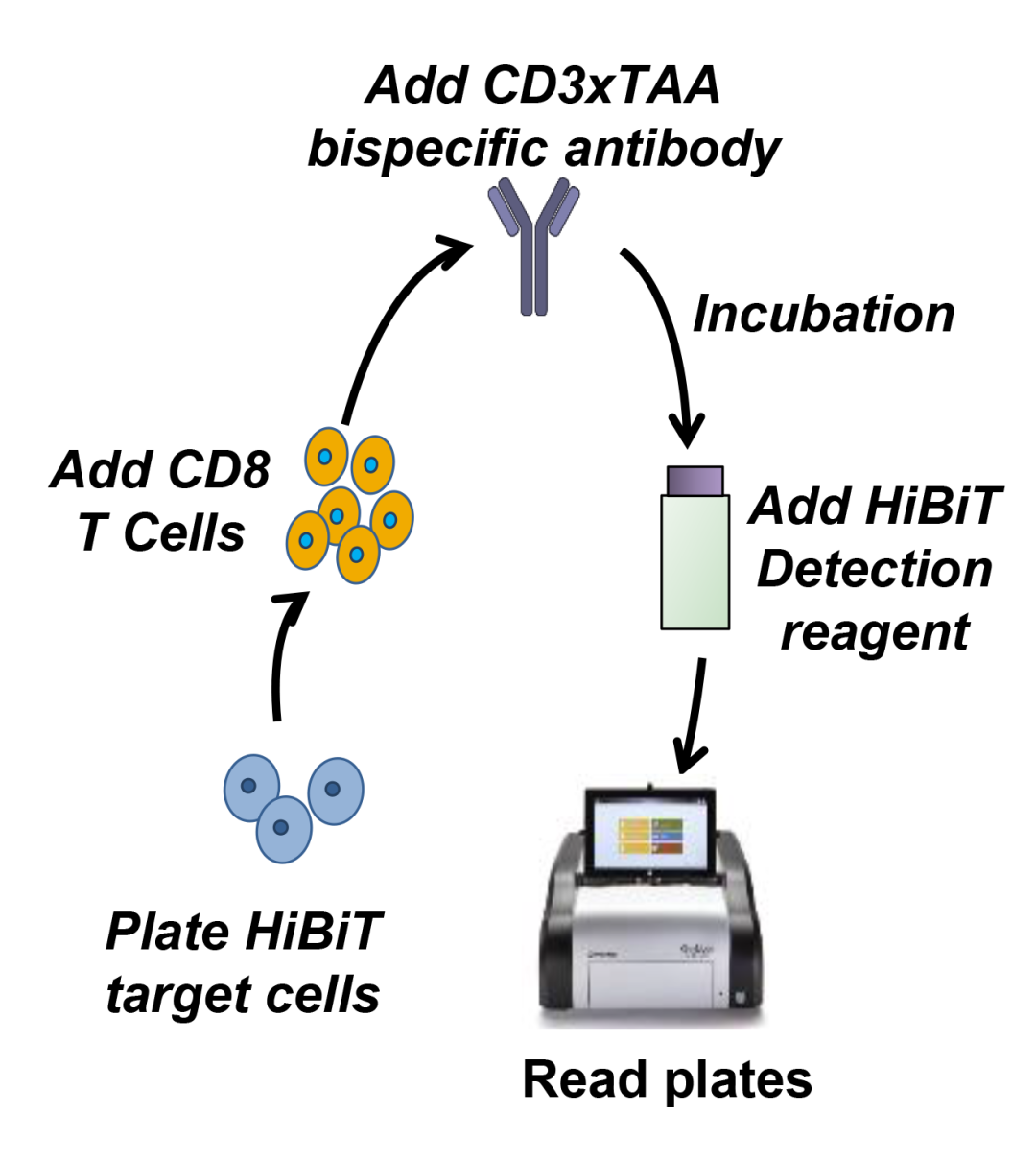 ● 将CD8 T细胞、CD3xTAA(肿瘤相关抗原)双特异性分子和表达HaloTag®-HiBiT的TAA+靶细胞共孵育可导致T细胞活化和靶细胞裂解,进而将HaloTag®-HiBiT蛋白释放至培养基中;