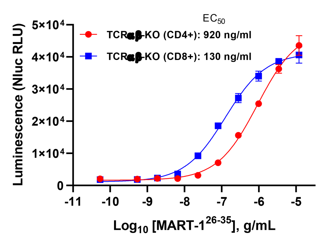 ● 将瞬时表达DMF4(MART-1特异性)TCR的TCRαβ-KO (CD4+) 和TCRαβ-KO (CD8+) 报告基因细胞与A375细胞(HLA-A2+)和MART-1肽滴定(26-35)进行共同孵育。