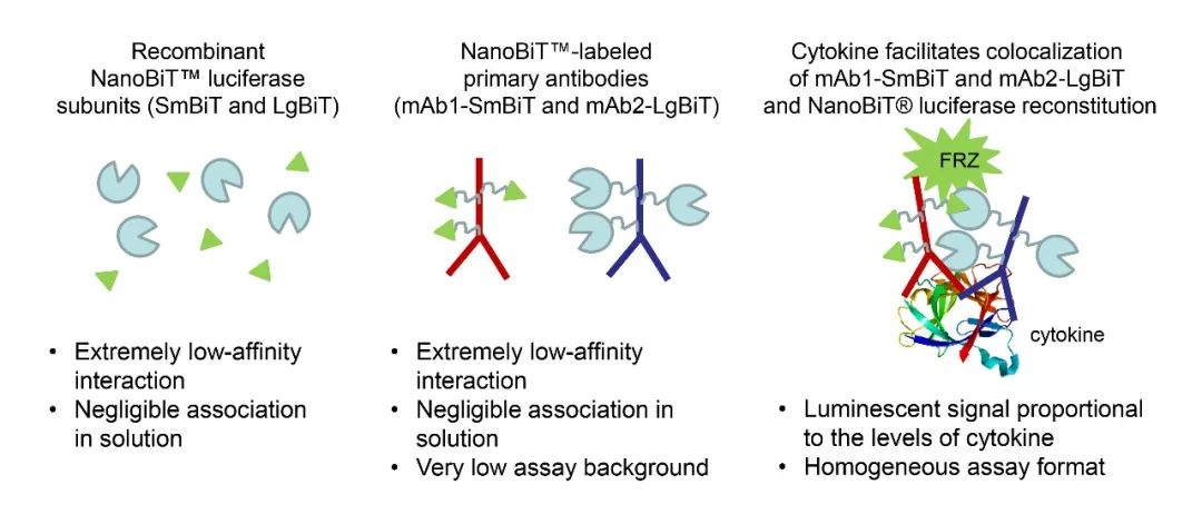 ● 该检测法采用NanoBiT®互补技术,并使用NanoBiT®标记的抗体进行细胞因子检测;