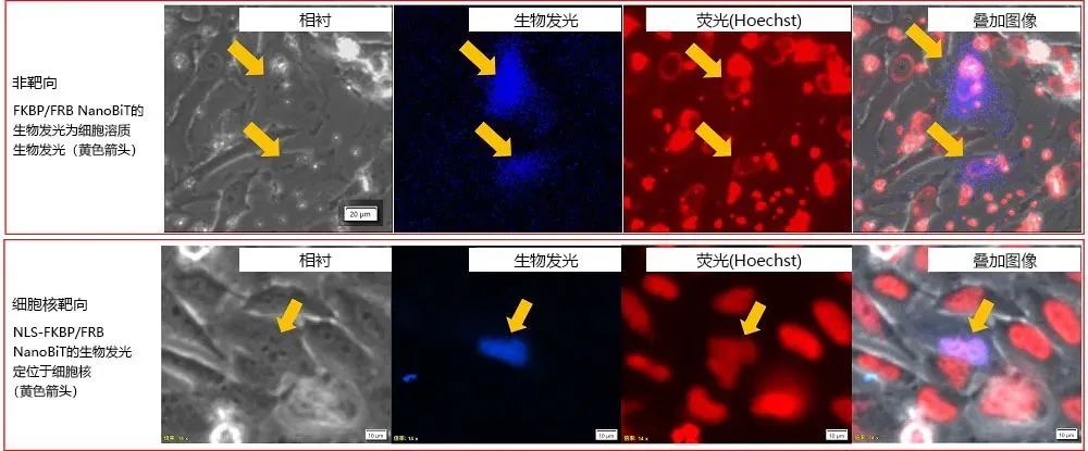图2. FKBP/FRB NanoBiT® 和NLS-FKBP/RRB NanoBiT® 的细胞内定位。