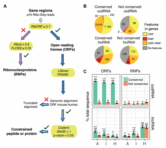 实验设计:从 Ensembl v.89 获取小鼠序列及调控区域,经筛选和重复序列屏蔽后,结合 BLASTN 识别小鼠与人类转录本的保守区域;采用小鼠海马体的 RNA-Seq 和 Ribo-Seq 数据,结合 RibORF 预测翻译 ORFs,借助质谱数据及 dN/dS、PhyloP 分析验证其功能性;运用 Rfoot 和 FLOSS 方法预测 RNP 位置,并结合 CLIP-seq 数据集验证,进而分析不同区域的 RNP 特征,同时还对基因进行分类以探究不同类型 lncRNAs 的特征。