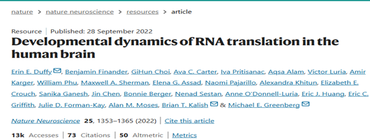 【1】Duffy E E, Finander B, Choi G H, et al. Developmental dynamics of RNA translation in the human brain[J]. Nature Neuroscience, 2022, 25(9):1333 - 1345. DOI:10.1038/s41593-022-01174-4