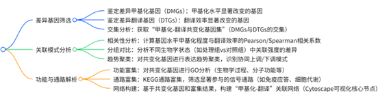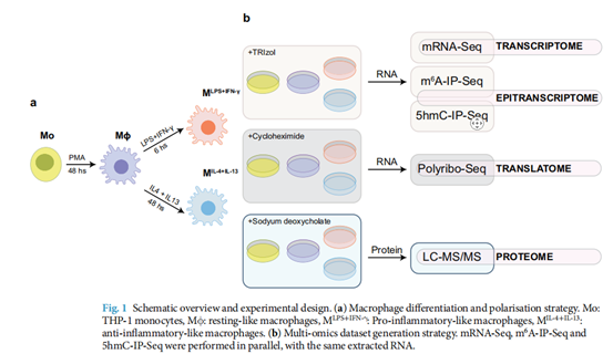 实验设计:研究者以 THP-1 单核细胞为模型,通过体外诱导构建四种细胞状态:单核细胞、静息态巨噬细胞、促炎样巨噬细胞和抗炎样巨噬细胞。对四种细胞进行多组学检测,转录组(mRNA-Seq)、表观转录组(m⁶A-IP-Seq 和 5hmC-IP-Seq)、翻译组(Polyribo-Seq)和蛋白质组(LC-MS/MS)。将同一份RNA 样本同步用于 mRNA-Seq、m⁶A-IP-Seq 和 5hmC-IP-Seq检测,以确保数据整合性并设置生物学重复,通过质量控制验证数据可靠性,再结合已知标志物和修饰特征(如 m⁶A 的 DRACH 基序、5hmC 的 UC 富集 motif)验证生物学一致性。