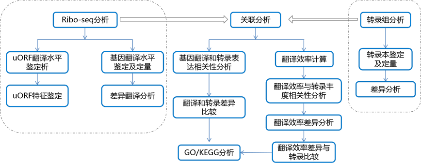 通过对比 mRNA 丰度(mRNA-seq)与核糖体结合效率(Ribo-seq),可以明确 mRNA 转录水平与蛋白质合成效率的关联性,区分转录调控与翻译调控的贡献。鉴定出的翻译调控事件,又可以发现转录组未体现的翻译起始位点、上游开放阅读框(uORF)及翻译效率差异,挖掘隐藏的调控机制。从而帮助研究者整合转录层面( mRNA 丰度)和翻译层面(核糖体结合效率)数据,构建更完整的基因表达调控路径,并且还能筛选出功能性候选基因,从 “高转录 - 低翻译” 或 “低转录 - 高翻译” 的差异基因中,锁定受翻译调控的关键功能基因,用以验证转录本的翻译活性,区分有翻译潜力的功能性 mRNA 与无翻译活性的非编码转录本,排除假阳性蛋白编码基因。在时空或处理条件下,同步追踪 mRNA 转录变化与核糖体结合动态,揭示基因表达的动态表达调控机制。