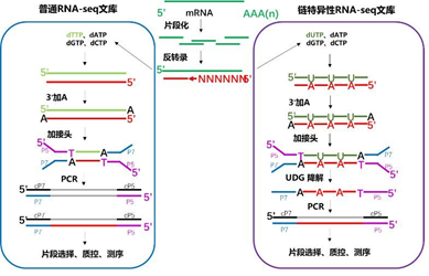 与普通文库相比,链特异性文库是在cDNA二链合成时用dUTP代替dTTP,PCR前采用UNG酶消化掉含dUTP的DNA单链,与Flowcell结合时只保留单一链模板,具体流程见下图: