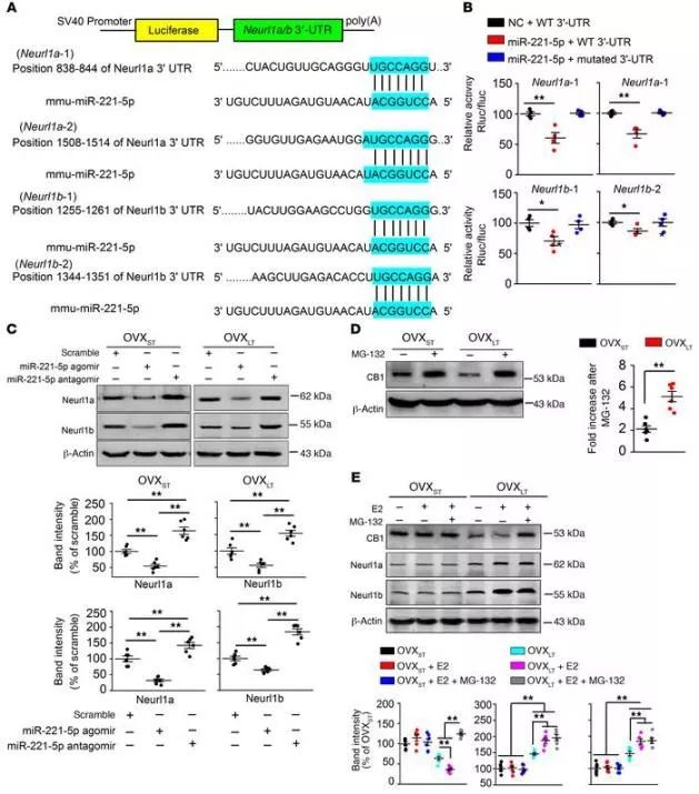 2. 高通量测序揭示了miR-221-5p的水平在长期雌激素缺乏小鼠中降低,其靶向E3泛素连接酶Neurl1a和Neurl1b。