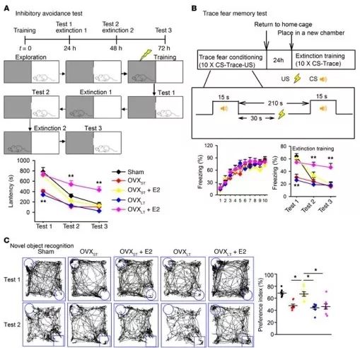 抑制性回避实验(图1A)、恐惧记忆测试(图1B)和新物体识别测试(图1C)结果显示注射E2显著促进OVXST和OVXLT小鼠的情境恐惧记忆形成和OVXST小鼠的恐惧记忆消退; 然而,注射E2的OVXLT小鼠中恐惧记忆消退受损。同时E2替代治疗也特异性地损害了OVXLT小鼠的工作记忆。