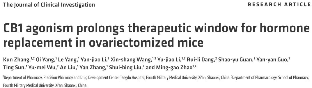 Zhang K,Yang Q, Yang L, et al. CB1 agonism prolongs therapeutic window for hormonereplacement in ovariectomized mice [J]. J Clin Invest., 2019.