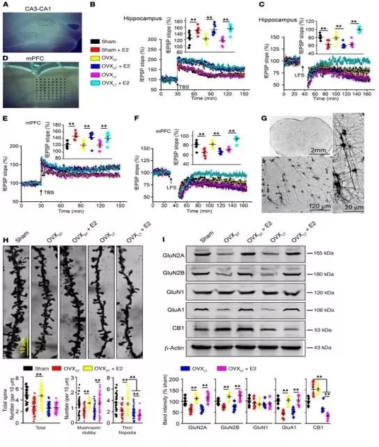 1)E2治疗促进了假手术组,OVXST和OVXLT小鼠的海马和mPFC中θ波刺激诱导的长期增强(LTP)的表达,但它仅促进假实验组和OVXST小鼠中低频刺激诱导的LTD的表达。此外,E2治疗在OVXLT小鼠中损害了长期抑制(LTD)(图2A-F);