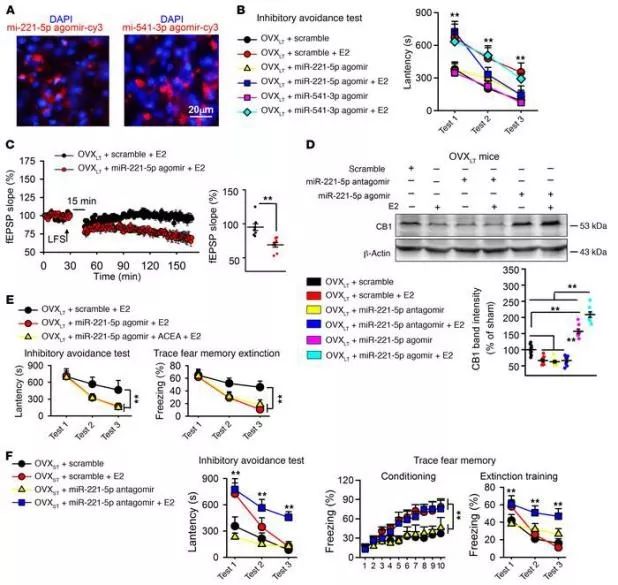 2)注射miR-221-5p agomir,而不是注射miR-541-3p agomir,在E2治疗的OVXLT小鼠的mPFC中可挽救恐惧记忆和LTD损伤(图5B和C);3)