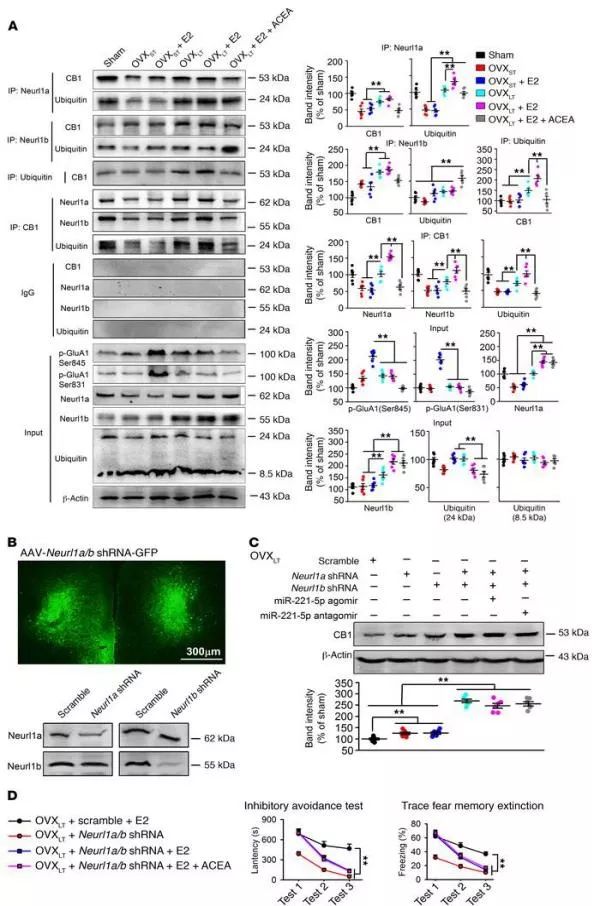 4)Neurl1a和Neurl1b的双重敲除挽救了OVXLT小鼠中E2诱导的恐惧记忆消退损伤(图7D),施用ACEA激活CB1并没有增强这种作用,表明两者靶向相同的信号传导途径。这些结果表明miR-221-5p / Neurl1 /泛素途径介导CB1泛素化增强。