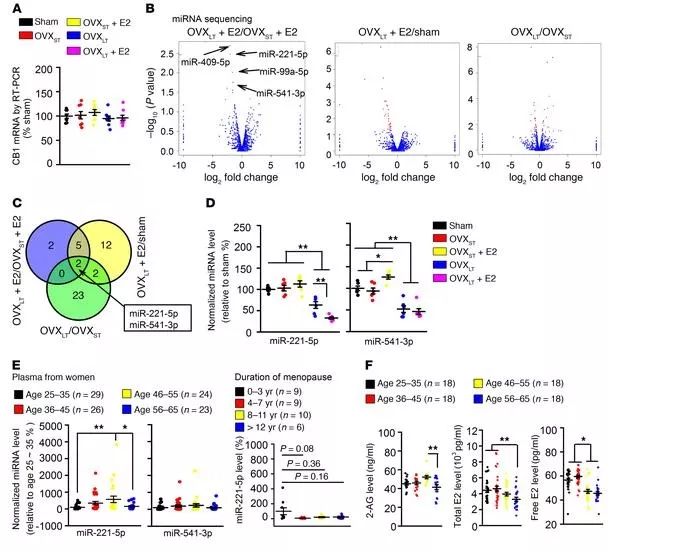 3)miR-221-5p在56-65岁的女性中较低(图4E)。在56-65岁的女性中,2-AG,总E2、游离E2和E3的水平也较低(图4F和补充图11)。