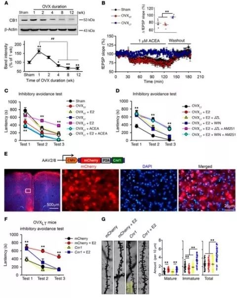 4)OVXLT小鼠的记忆消退损伤可被AM251(CB1选择性拮抗剂)阻断(图3D),表明CB1在接受E2治疗的OVXLT小鼠的记忆消退损害中发挥着关键作用;