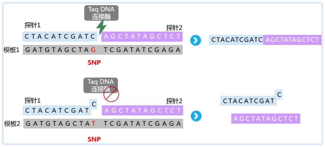 从上方示意图汇总可以看出,DNA模板仅有一个碱基不同,就会导致连接产物的完全不同。因此,这种方法可以用来检测SNP的不同基因型。
