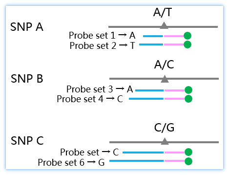 具体如何检测出来的呢?假如这里有三个SNP位点,A、B和C,针对每个SNP位点的基因型,分别设计两套探针,每一套探针由蓝色的可变长度链和粉色的荧光标记链组成。例如针对SNP A,我们设计probe set1和2,分别检测基因型A和T。如果SNP位点基因型是A,那么probe set 1可以完全与模板互补配对,从而被连接到一起。如果也有T基因型,那么probe set 2也可以被连接到一起。