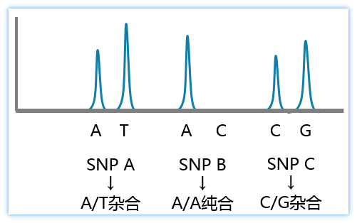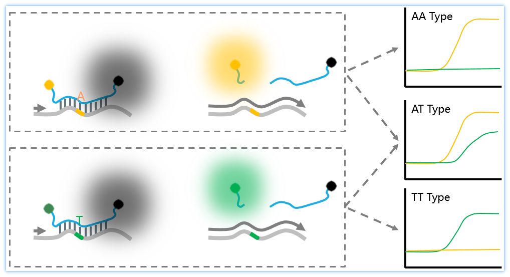 MGB探针非常短,仅有十几个核苷酸的长度,针对不同的SNP基因型,分别设计其对应的探针,不同的探针带有不同的荧光基团,在PCR过程中,只有与模板完全匹配的探针才能完全互补配对,并被水解发光。哪怕只有SNP位点的一个碱基不同,也会导致探针无法结合。因此,根据PCR之后的扩增曲线,即可判断出样本的基因型。