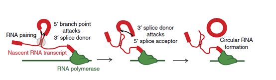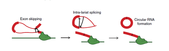 在可变剪切过程中,外显子发生跳跃,形成了套索结构,拉近了剪切位点序列之间的距离,最后通过剪切,形成环状