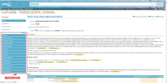 进入蛋白页面后,可以看到以下信息左边的列表可以知道蛋白性质的分类,点击后可以快速到达相应位置。打开页面就可以看到蛋白的全称基因的名称以及功能的相关信息。