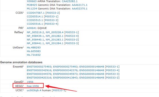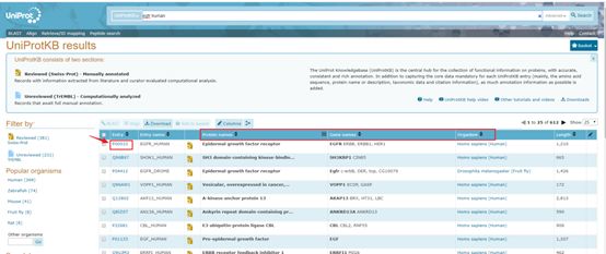 点击后在出现的页面中,根据需要目的蛋白的物种以及名称,确定红色箭头为目的蛋白,点击“P00533”进入目的蛋白页面。