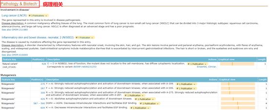 在病理学相关信息中,可以了解和此蛋白相关的疾病,及相关诱变位点信息及其相关影响等。