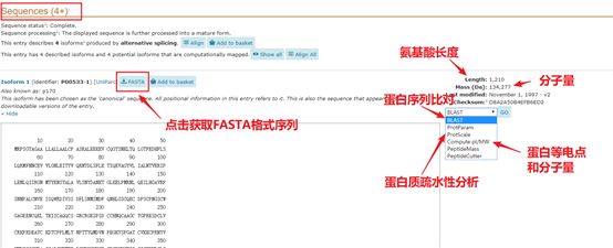 在序列中,可以获取蛋白的序列信息,有几个亚型,可以查询到蛋白的分子量,长度,等电点,疏水性等信息。还可以看到自然突变体的信息等。而且可以进入KEGG的相关网站中,了解此蛋白相关的所有通路。