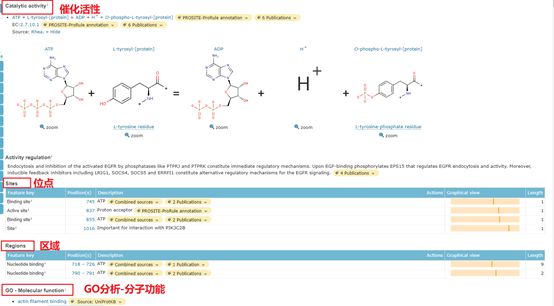 回到原来的页面往下拉,可以看到蛋白相关的其他信息。在功能中可以看到GO分析中的分子功能和生物过程,还有相关催化活性和活性的相关位点等。