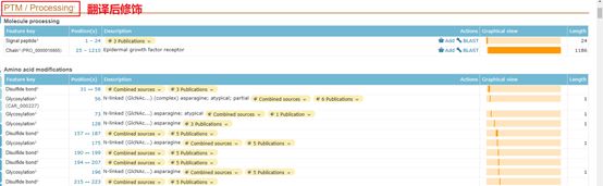 在翻译后修饰中,可以看到蛋白的信号肽,具体的氨基酸修饰,磷酸化,二硫键,糖基化位点等。