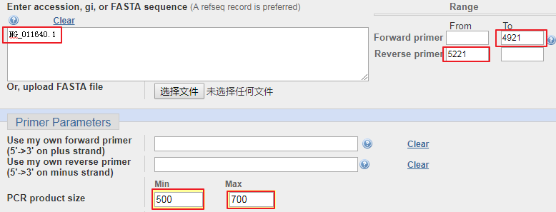 点击该按钮,会进入引物设计页面,此时,基因登录号NG_011640.1已经自动填写到了序列框中。