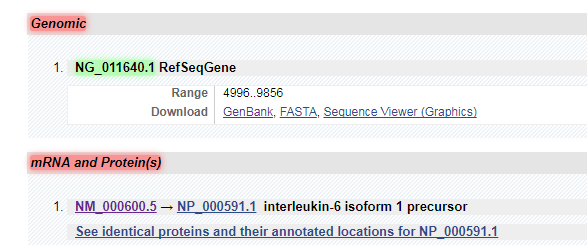 此时有两个主要的部分,分别为 Genomic 以及 mRNA and Proteins ,鼠标选中并复制Genomic中的基因登陆号NG_011640.1 (绿色)。