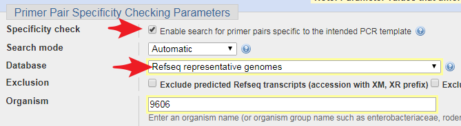 如果需要NCBI设计特异性的引物(虽然经常不准确),则可以在Primer Pair Specificity check处进行勾选,数据库选择对应物种的基因组。