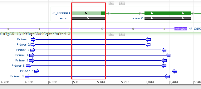 首先我们需要限定引物设计的范围:正向引物不能超过exon1的左侧,即4921,而反向引物一定要超过exon1的右侧,即5221。
