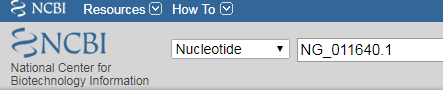 3. 在新的NCBI页面中,选择Nucleotide,粘贴该基因号,并搜索,弹出的页面,即是NG_011640.1的基因页面。