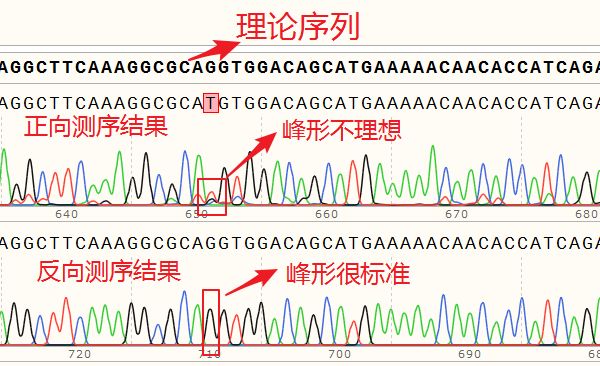 正向测序的峰高非常矮,并且出现了套峰,从而产生误读;相比之下,反向测序的峰形十分标准,因此,综合判断,该处反向测序的结果更为可信,即该处没有发生突变。