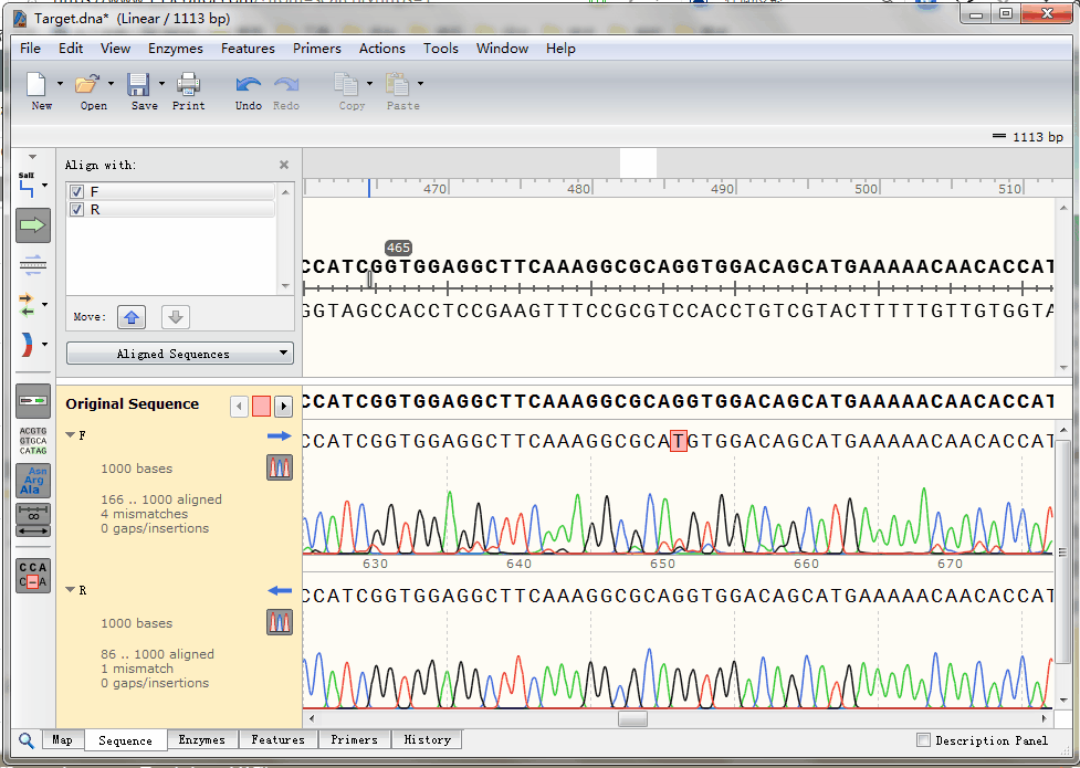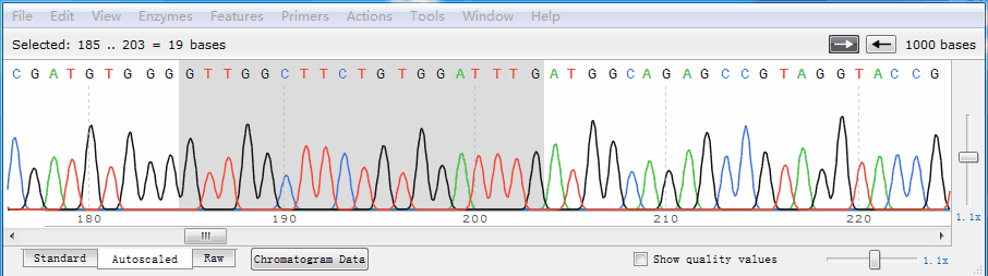 如果拼接结果与理论序列完全一致,则皆大欢喜;如果结果中有碱基与理论序列不一致,那么就需要根据ab1文件详细分析了。