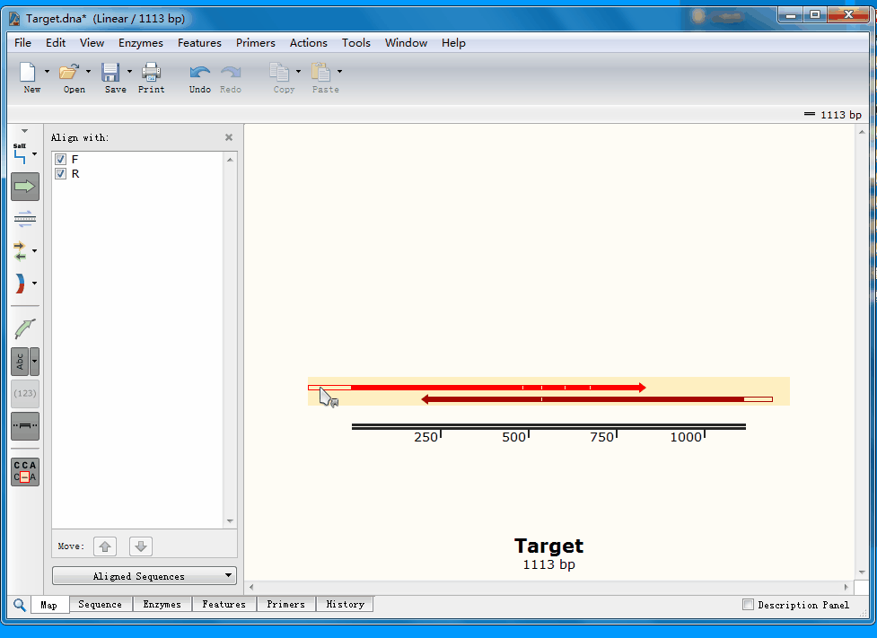2.删除测序结果中的seq文件,免得其干扰我的思路。在理论序列文件中,点击Tools →align multiple sequences,选择正、反向测序的ab1文件。这样就得到了理论序列与正反向测序峰图的比对图: