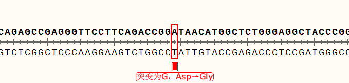4. 点击图中按钮,可以迅速查找到下一个不匹配碱基,可以看到,正反向测序的峰形都很标准,也就是说这里的确是实际序列与理论序列不一致,点击“预测编码蛋白”按钮,还可以看到该突变位点在CDS编码蛋白氨基酸序列中的位置,即GAT变为GGT,编码氨基酸由天冬氨酸变成了甘氨酸。