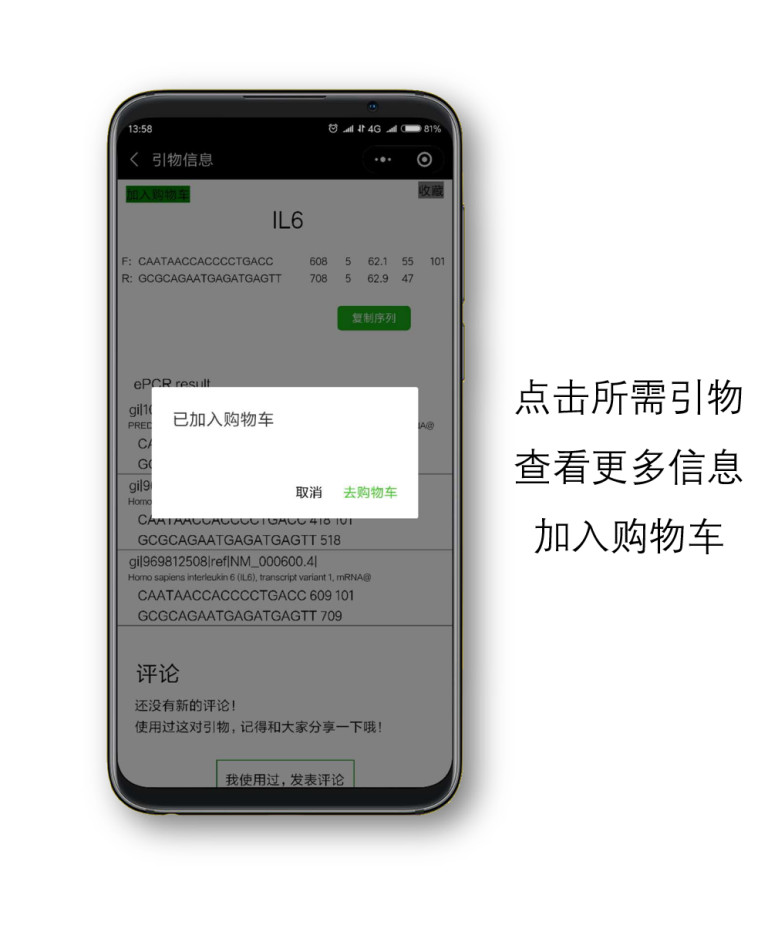 点击基因名前的加入购物车则将该引物保存在“个人”中的购物车页中,可以直接在生工合成;