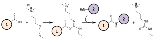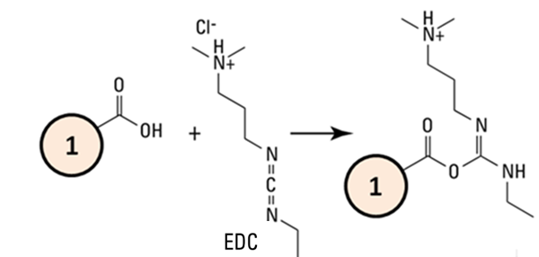 羧基(-COOH)一般和碳二亚胺(如:EDC)反应,再生成NHS酯结构。而NHS酯又可以跟氨基发生交联
