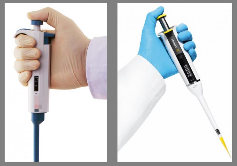 左边的移液器的刻度盘在一侧,明显是为右手惯用手设计的,而右侧赛多利斯移液器则将其安排在了中间,呈对称结构,左右手通用。