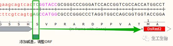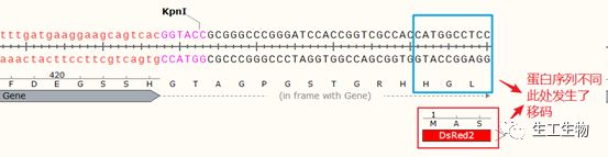 观察目的基因向下游表达至DsRed2中的氨基酸序列(HGL),发现与DsRed2原始序列(MAS)不同,即发生了移码,完整的阅读框遭到了破坏。因此,我们需要在目的基因下游与KpnI之间添加碱基恢复其阅读框的正确。
