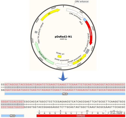pDsRed2-N1质粒可以直接在SnapGene的序列库中找到,导入方式在前面的文章中已经介绍,这里不再赘述。从图谱中选择多克隆位点区域MCS,点击,并转到序列页面: