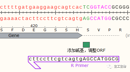 因为目的基因需要融合下游的荧光蛋白进行示踪,所以调整阅读框的通顺性是非常重要的,首先将目的基因中的终止密码子去除,然后将载体上EcoRI+KpnI之间的序列替换为去除终止密码子之后的目的基因的序列: