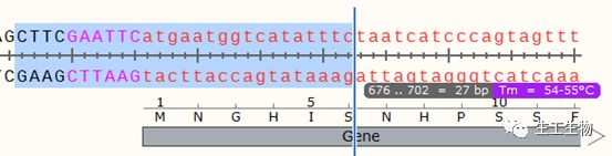 设计全长引物的软件有Primer5、Primer3Plus等,但小编更偏好于手动设计引物,在目的基因5端,用鼠标选中合适的区域(保护碱基-酶切位点-互补配对部分),当选择区域适合作为引物时,会实时显示出其Tm值: