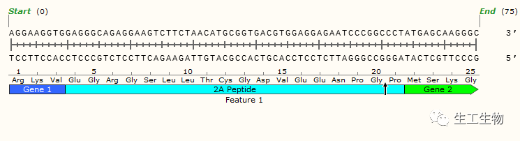 2A肽的剪切效率极高,昆虫病毒和猪捷申病毒中的2A切割效率几乎是100%,因此使用2A肽作为共表达元件,能够实现多蛋白的等量表达。2A肽的DNA序列也是很容易查到的,在一些商业化的真核共表达载体中能够查到,这些质粒的名称中通常有2A字样,一个典型的序列为EGRGSLLTCGDVEENPG*P(*为切割位点),其DNA序列为54bp,也是可以通过长引物PCR将其引入基因中的。以上是2A肽的两个最突出的优点。
